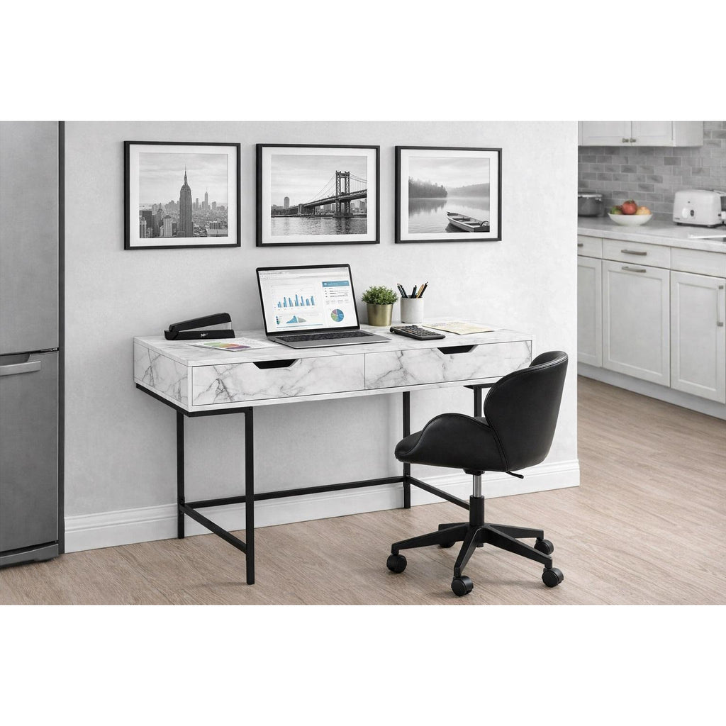 - Computer desk with a white marble-effect wood finish and two storage drawers featuring wide, cut-out handles and metal drawer slides.