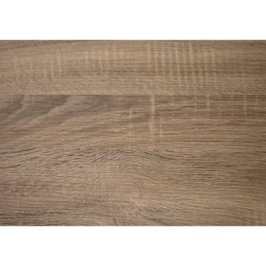- Open and closed storage options include two fixed open shelves on the left, one large storage drawer with a black metal handle and metal drawer glides under the main desktop, and a hutch with three compartments on the right.