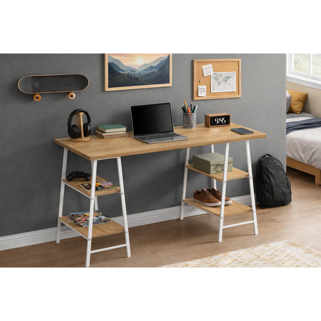 - Industrial-style computer desk with four fixed and open shelves supported by trestle-style legs in a white metal finish.