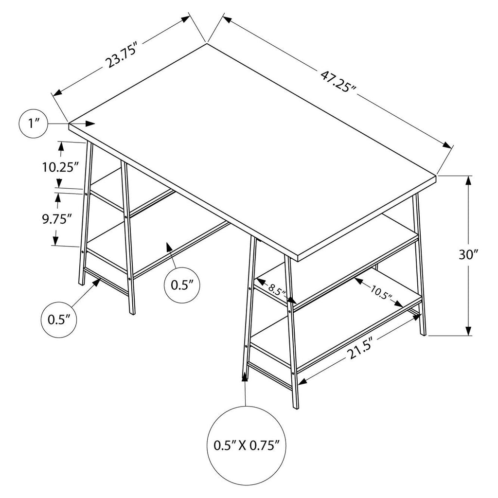 - The thick, rectangular desktop and four shelves in two different sizes are finished in a natural wood-look finish.