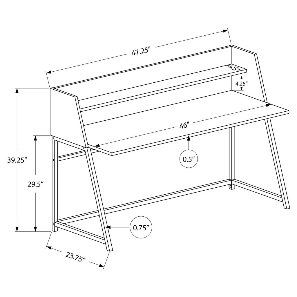 - Computer desk with a black faux marble finish and a small hutch with one long black shelf.