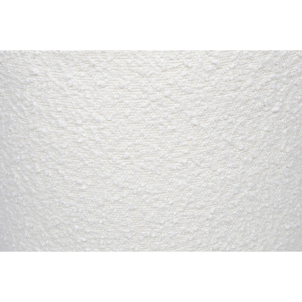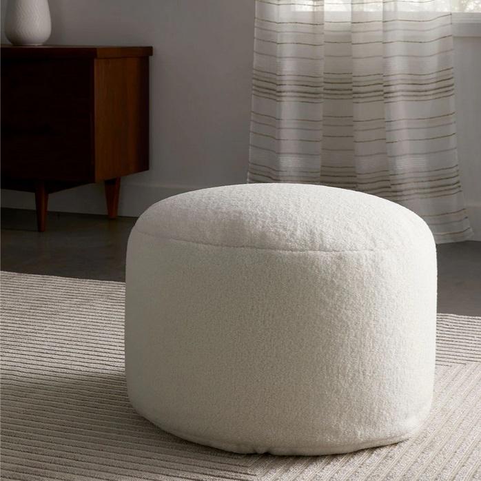 Round Ottoman. - Material: 100% Polyester Sherpa. - Weight: 8 lbs. - Filled with 100% recyclable polystyrene beads. - Made in Canada.