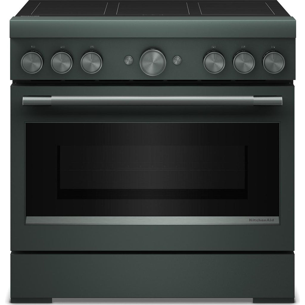 This KitchenAid® 5.1 cu. ft. 36-inch 6-Element Induction Freestanding Commercial-Style Range combines the precision of induction with the power of... This KitchenAid® 5.1 cu. ft. 36-inch 6-Element Induction Freestanding Commercial-Style Range combines the precision of induction with the power of Air Fry. Sensor-induction cooktop generates heat directly within cookware, and the oven features Even-Heat™ True Convection plus air fry mode that aids in crisping and browning. View more