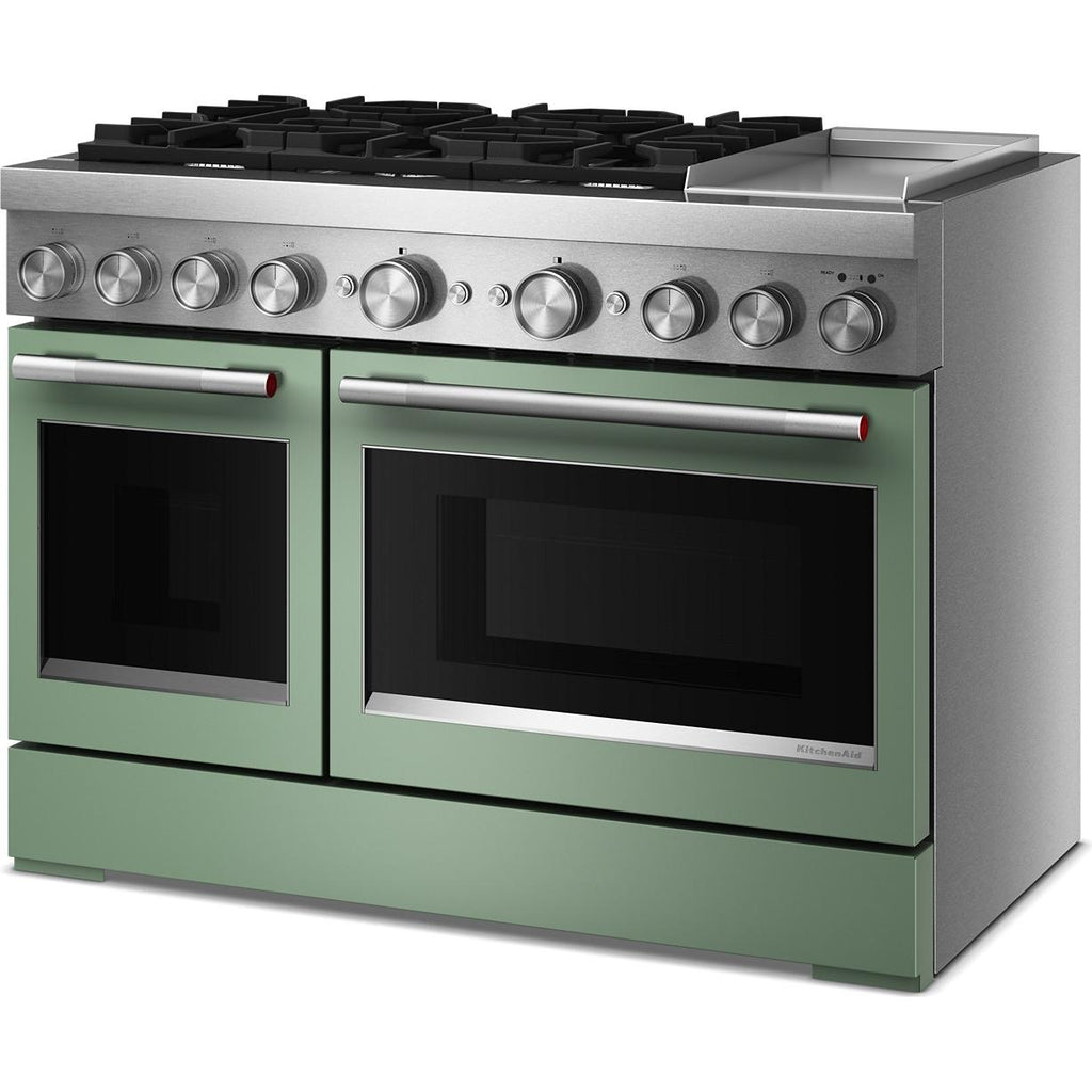 Satisfy your craving to create with a 48-inch KitchenAid® Commercial-Style Range with Chrome Electric Griddle. This dual fuel range combines... Satisfy your craving to create with a 48-inch KitchenAid® Commercial-Style Range with Chrome Electric Griddle. This dual fuel range combines an electric double oven with a 6-burner gas cooktop. Two 20,000 BTU Ultra Power™ Dual-Flame Burners offer power and precision to successfully sear, simmer, stir-fry and sauté. Even-Heat™ True Convection gives consistent baking and roasting, plus air fry mode that yields crispy, golden results. View more