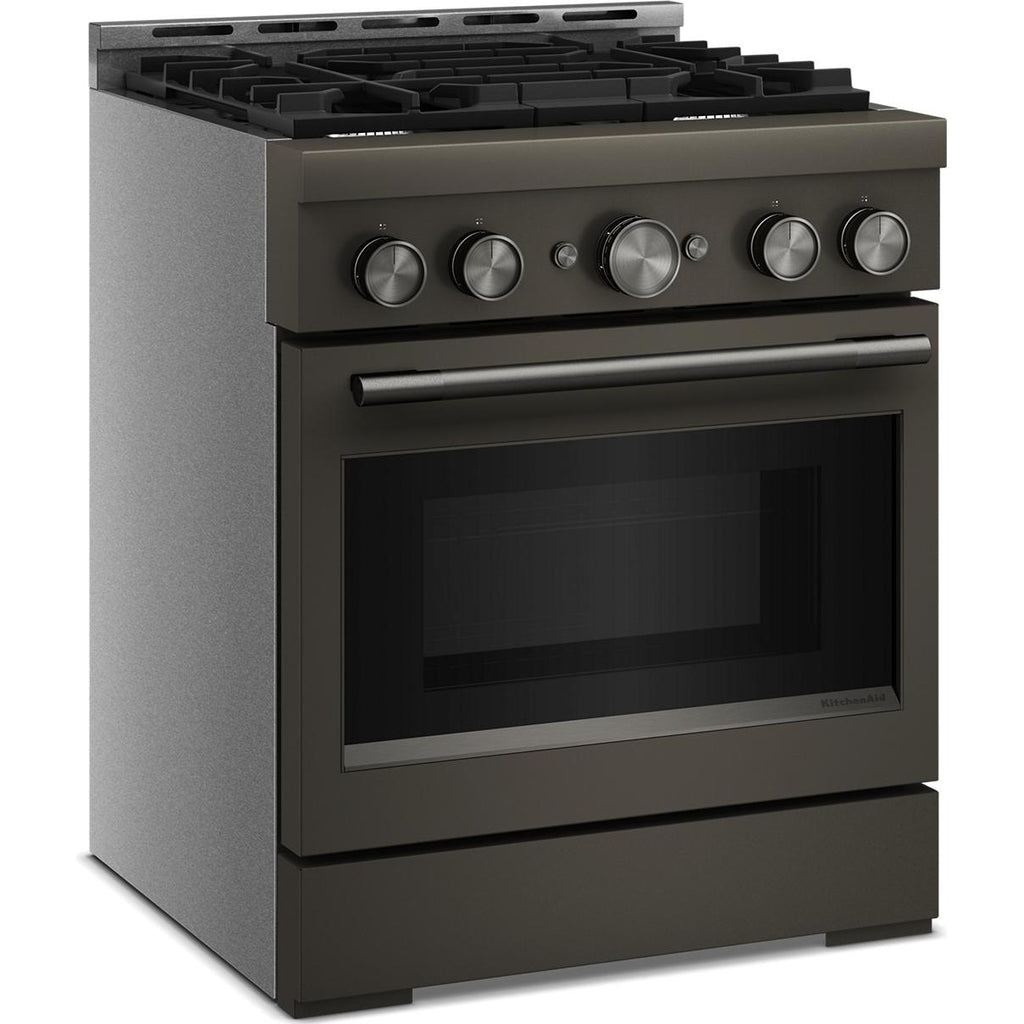 Empower your creativity with a 30-inch KitchenAid® Commercial-Style Range with 4 burners. This gas range features two versatile 20,000 BTU... Empower your creativity with a 30-inch KitchenAid® Commercial-Style Range with 4 burners. This gas range features two versatile 20,000 BTU Ultra Power™ Dual-Flame Burners with the power and precision needed to successfully sear, simmer, stir-fry and sauté. Even-Heat™ True Convection gives consistent baking and roasting, plus air fry mode that yields crispy, golden results. View more
