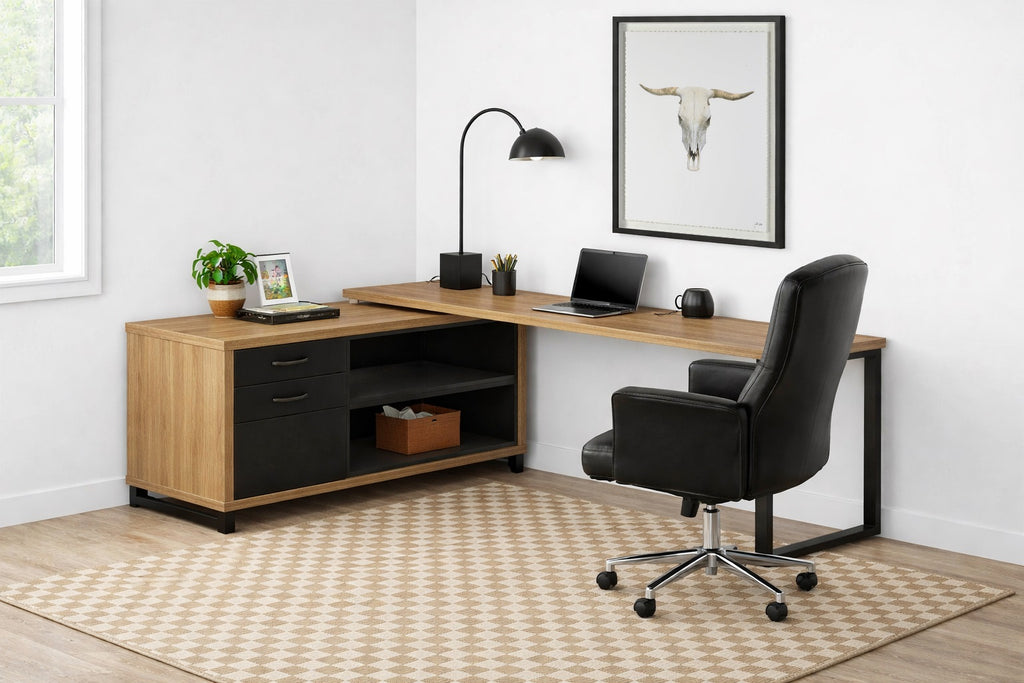 • L-Shaped computer desk with storage featuring thick-panel construction in a light reclaimed wood-look finish