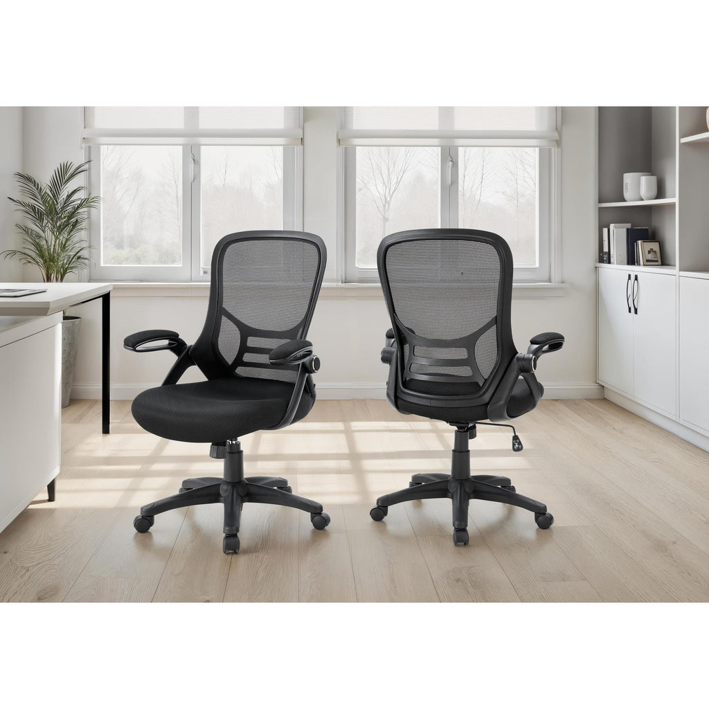 • This contemporary office chair combines a fashionable style with practical functionality, complete with flip-up padded armrests, adjustable height and tilt function for customized comfort