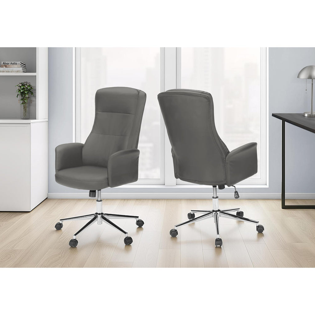 • This modern grey leather-look office chair features a high back design and plush foam cushioning, ensuring you stay comfortable during long work hours