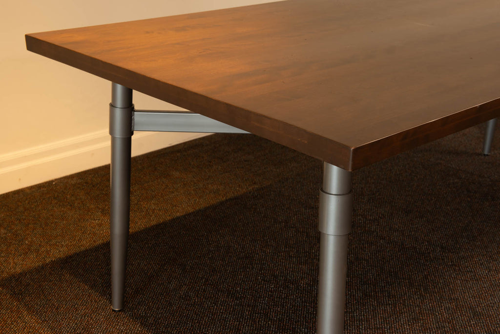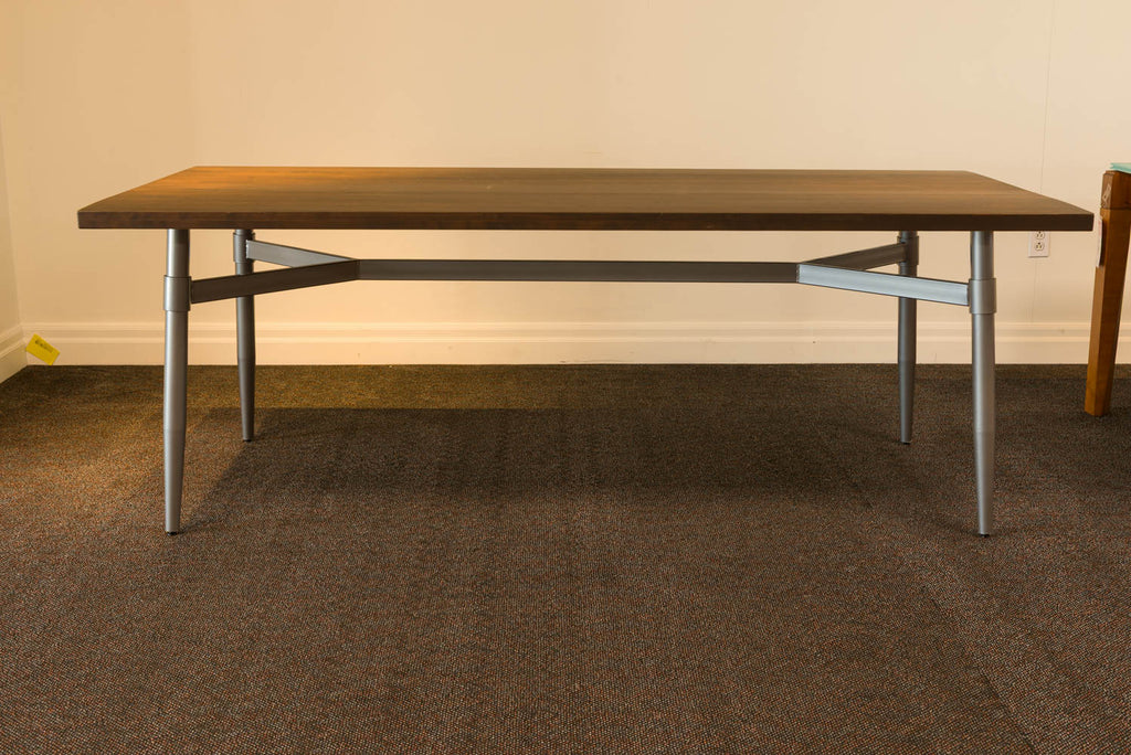 Table de salle à manger dessus en merisier de couleur brun et pattes en métal argent. Dimensions: 84'' x 40''... Table de salle à manger dessus en merisier de couleur brun et pattes en métal argent. Dimensions: 84'' x 40'' x 30''H  1 stock. *Quelques égratignures sur le dessus de la table. View more