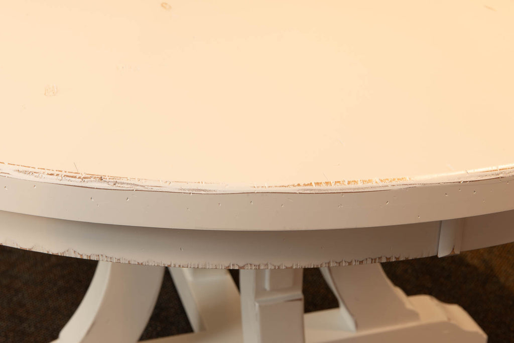 Table de salle à manger en merisier fini rustique de couleur blanc. Dimensions: 54'' diamètre x 30"H.