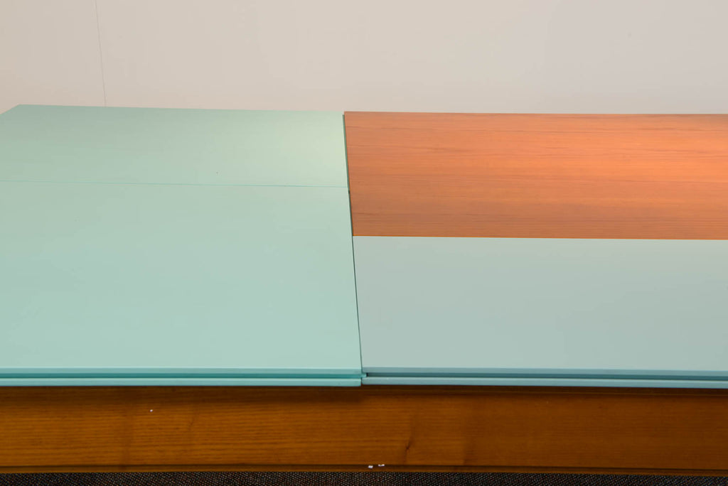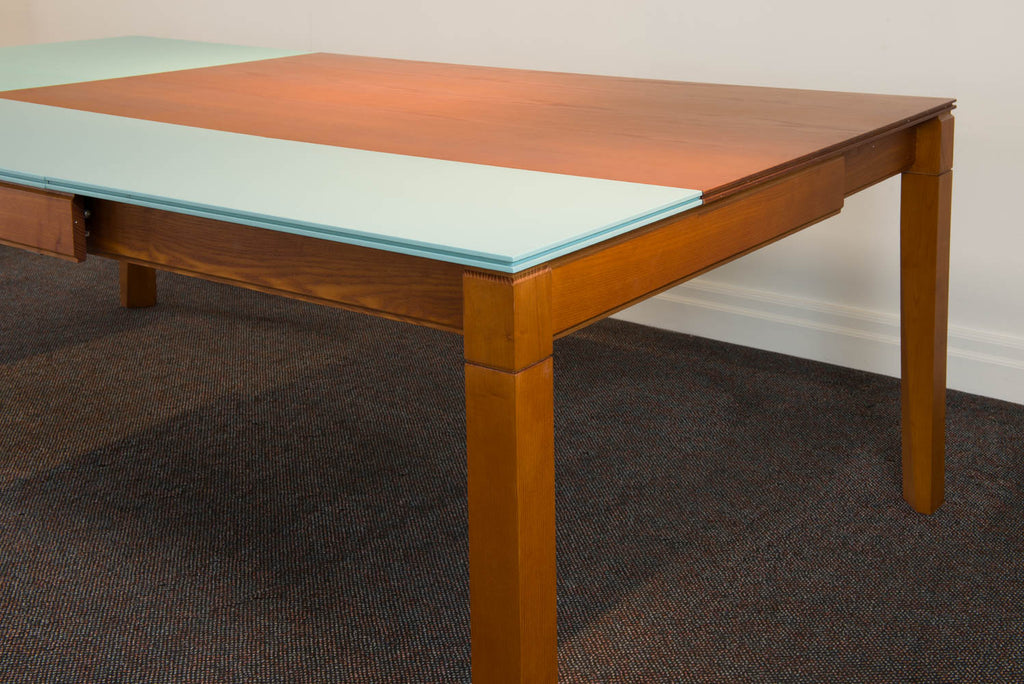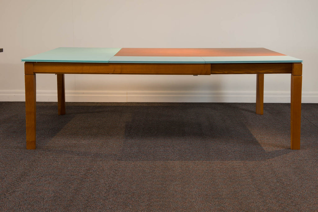 table de salle à manger dessus : 91'' x 52'' x 30''H  rallonges inclus couleur: cognac /bleu 1 stock