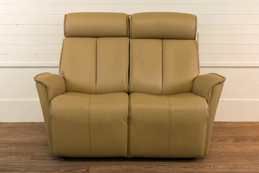 Causeuse inclinable électrique en cuir de couleur beige. Dimensions: 53'' x 29'' x 41''H Marque Fjords, 1 disponible.