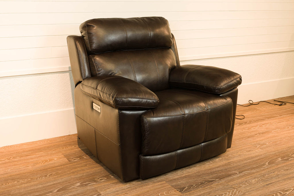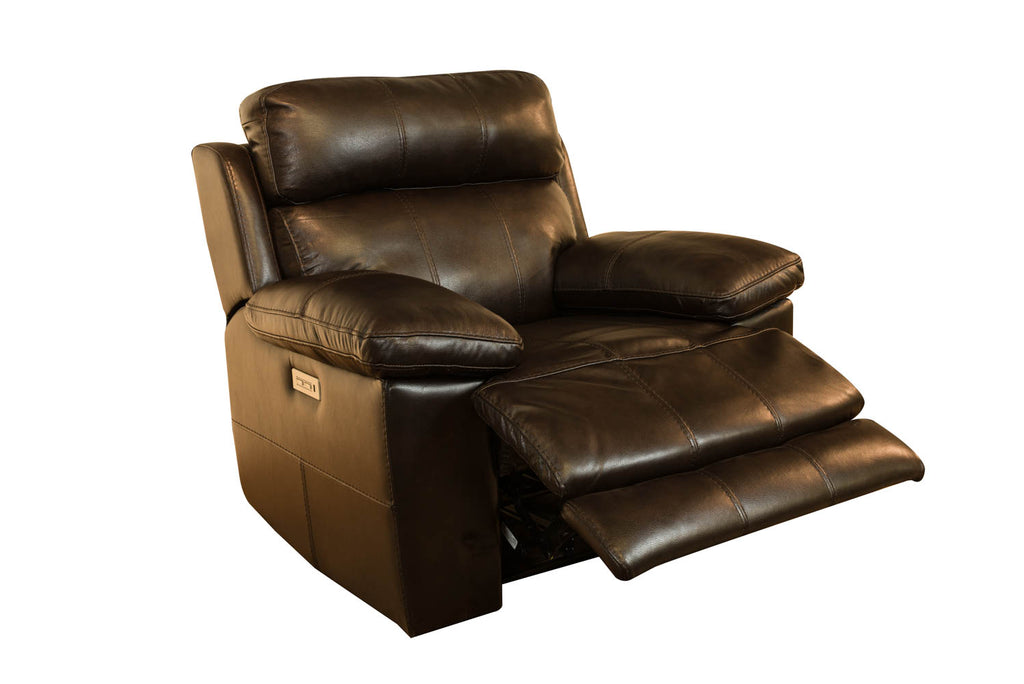 Fauteuil en cuir brun foncé avec tête et siège inclinable électrique. Dimensions: 42'' x 32'' x 39''H