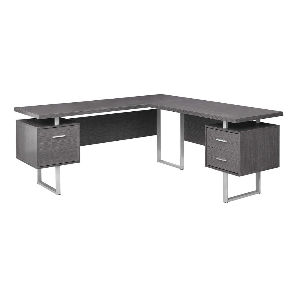Bureau d'ordinateur à panneaux épais en forme de L au fini gris avec 3 tiroirs de rangement et 3 pieds en métal au fini argenté