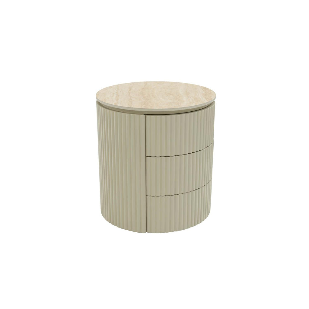Produit d'importation. - D'une couleur souvent beige ou grise, le travertin est apprécié pour sa durabilité, sa résistance à l'usure, et sa polyvalence avec plusieurs style en décorations. - Boutons poussoir pour l'ouverture des tiroirs. - Bordure bronze à la base.