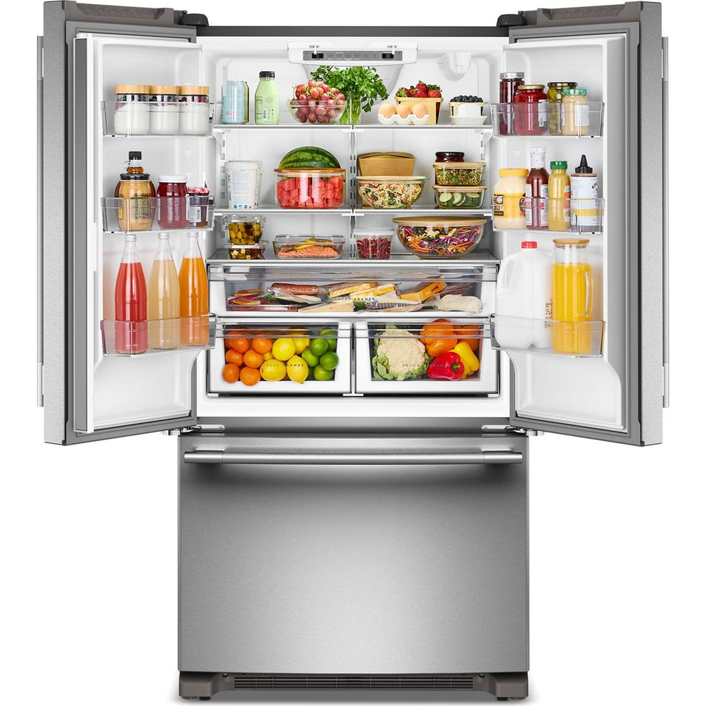Réfrigérateur français KitchenAid à 3 portes avec tiroirs plus croustillants et éclairage intérieur.
